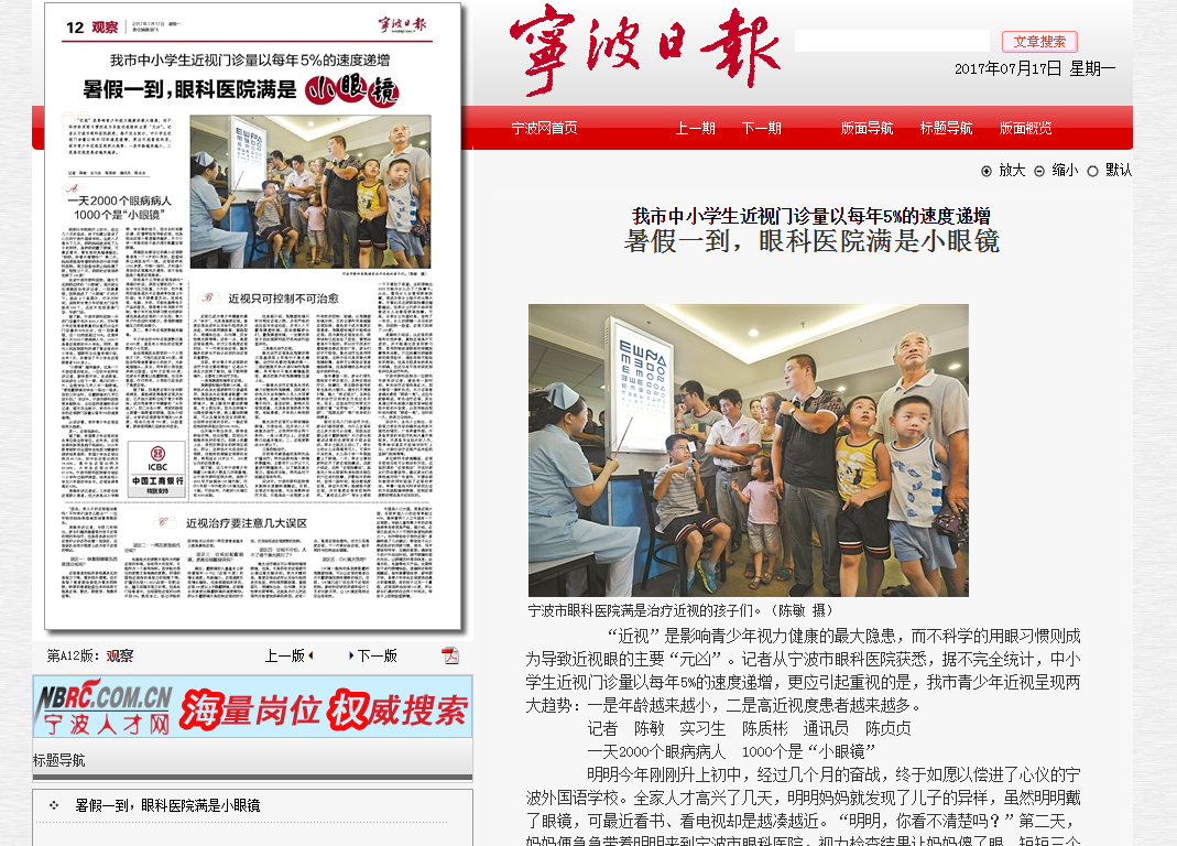 据了解,我国青少年近视的发生率位居全球首位。近年来,近视发病年龄更是趋于低龄化。2016年教育部针对全国学生体质与健康的调研结果表明:我国小学生近视比例为45.71%,初中生近视比例为74.36%,高中生近视比例为83.28%,大学生近视比例为87.67%。宁波市眼科医院曾对城区一小学作过抽样调查,结果发现小学五六年级的学生中,近视发病率高达52%。