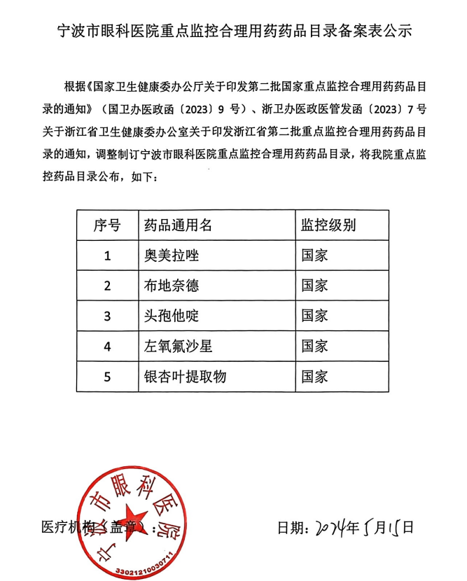 宁波市眼科医院重点监控合理用药药品目录备案表公示